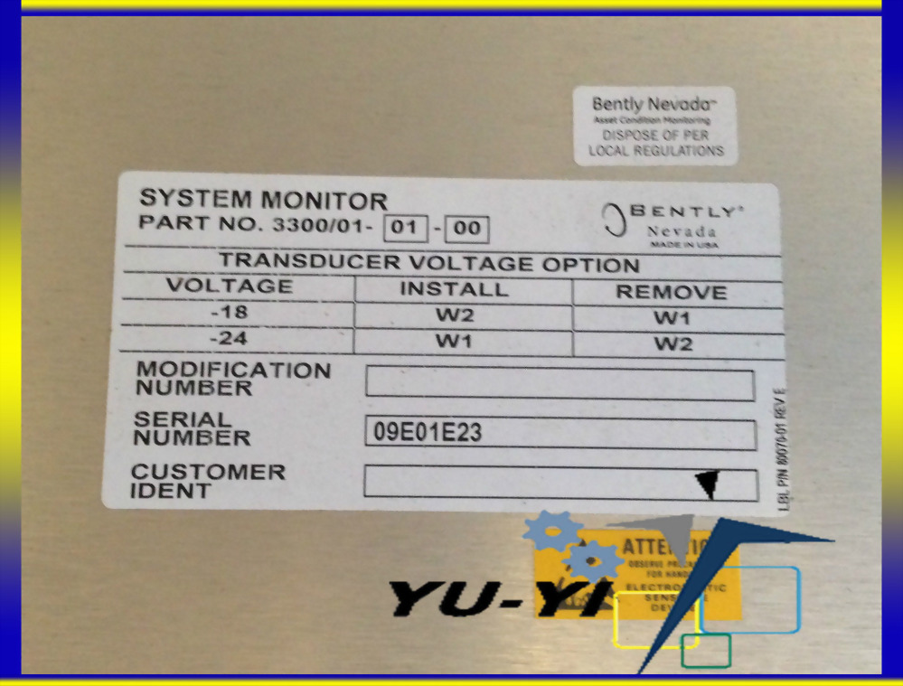 BENTLY NEVADA SYSTEM MONITOR 3300/01-01-00 TRANSDUCER VOLTAGE OPTION 09E01E23