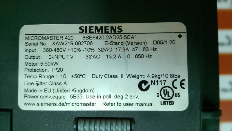Model : SIEMENS MICROMASTER 420 6SE6420-2AD25-5CA1